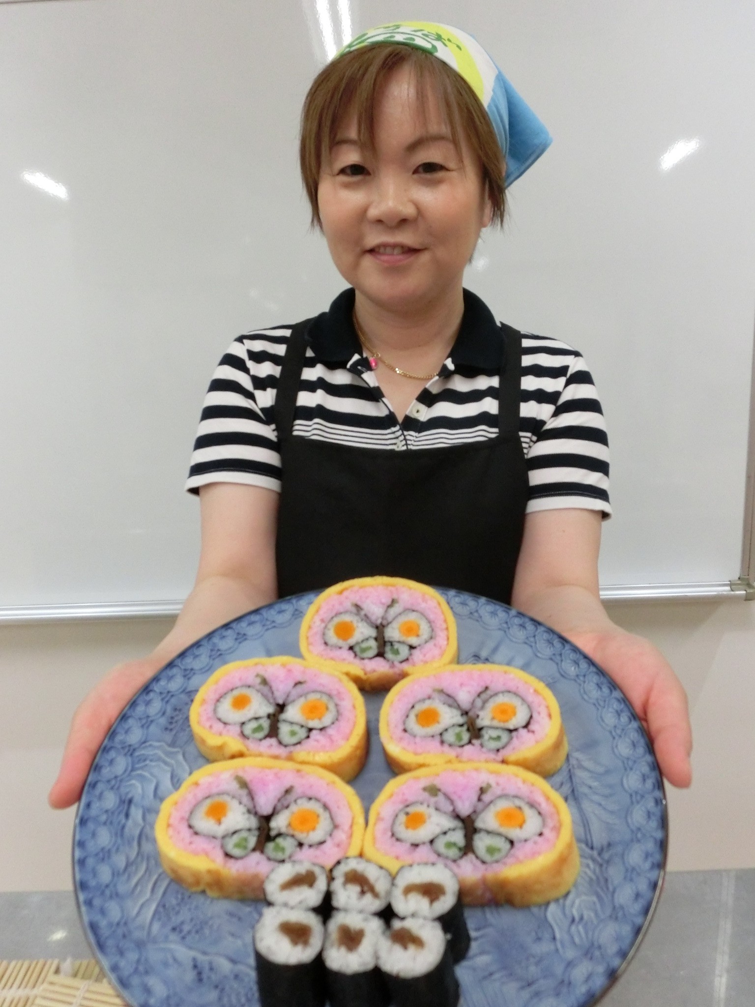 ↓石橋先生と完成した太巻きまつり寿司(アゲハチョウ)