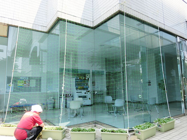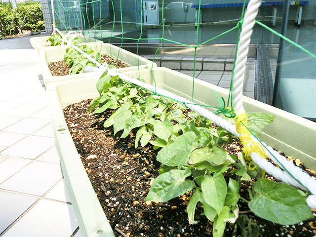 体育棟のロビーの大窓を覆ってやわらかい自然の日陰をつくってくれるはずです。。。