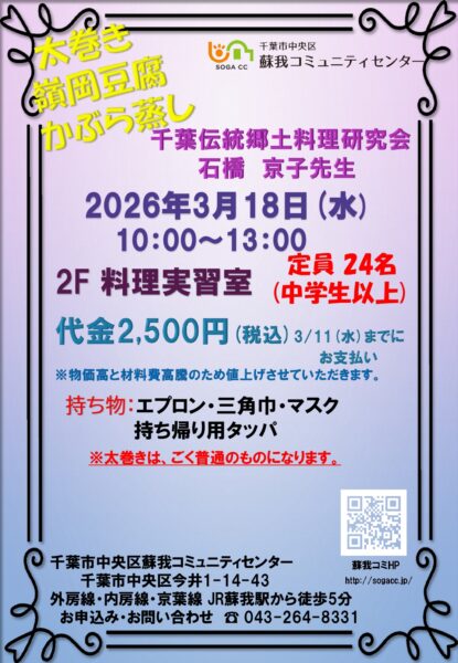 | 申込決定方法 | 受付窓口・お電話(043-264-8331)・講座予約フォームにてご予約ください。 ※予約締切日:3月11日(水) |