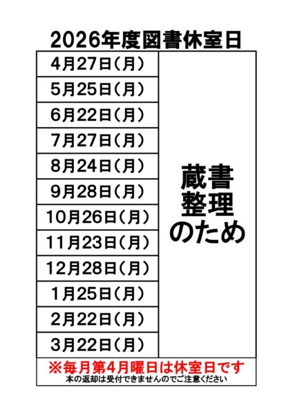 ホームお知らせ一覧2026年度図書室 休室日のお知...