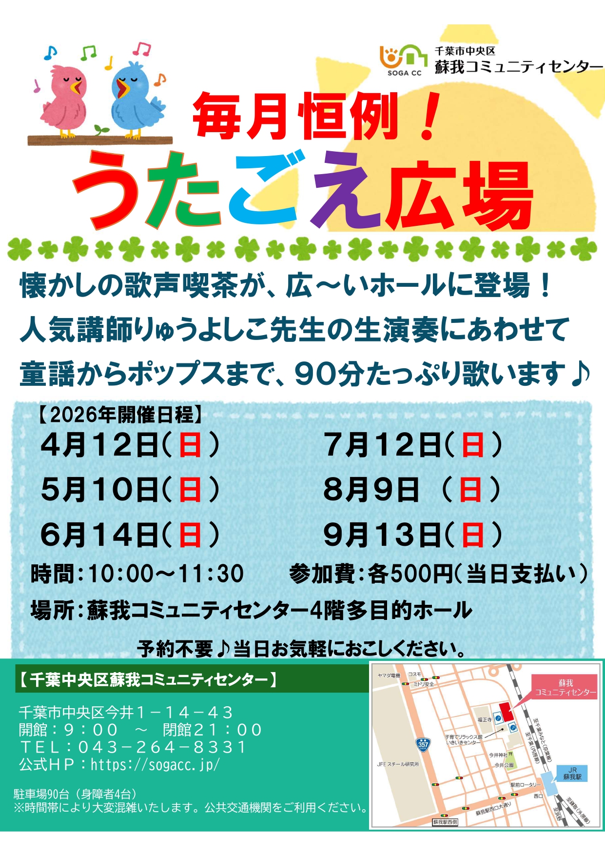 毎月第二日曜日は、蘇我コミの広いホールでたのしく元気に、大きな声でいっしょに歌いませんか??…