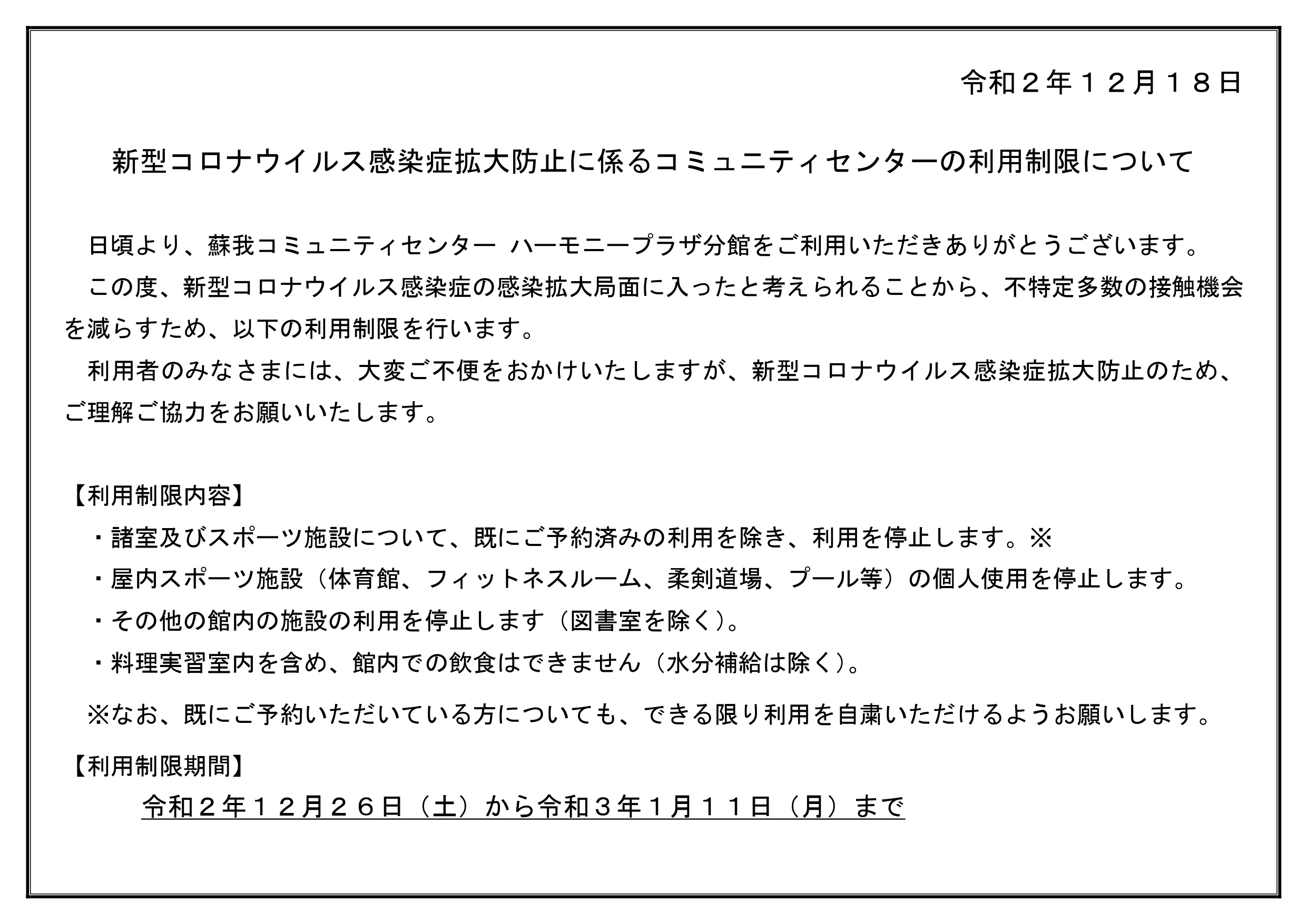 【重要】新型コロナウイルス感染症拡大防止に係るコミュニティセンターの利用制限について(2020.12.18)
