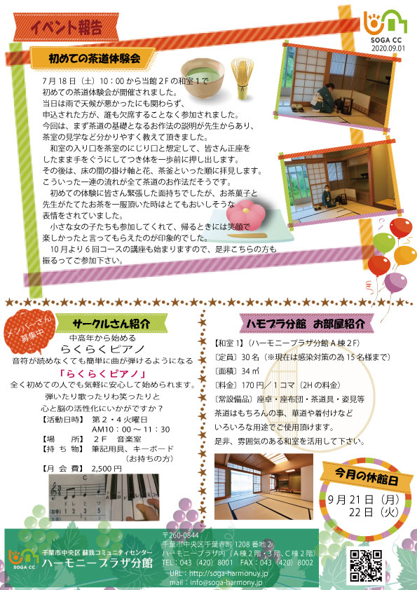 9月のイベントや7月に開催された茶道体験会の報告などを