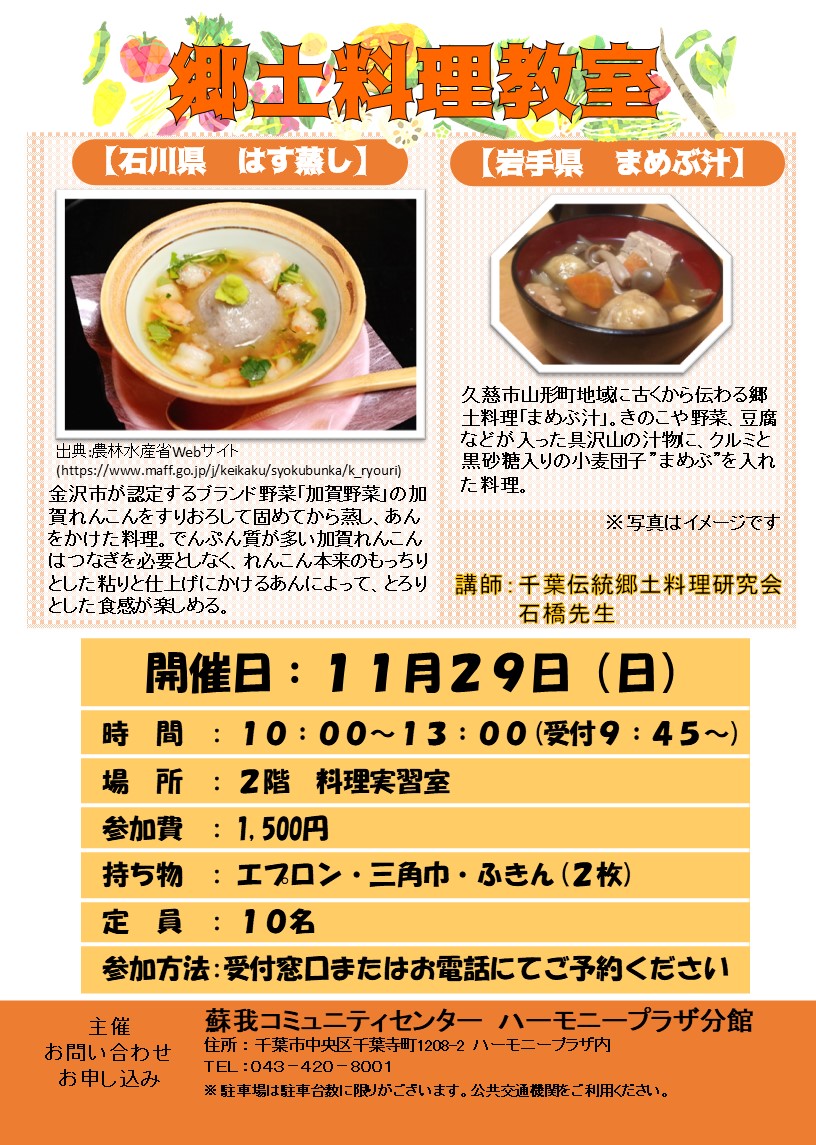 第3回目の郷土料理教室は【石川県 はす蒸し】・【岩手県 まめぶ汁】を作ります!