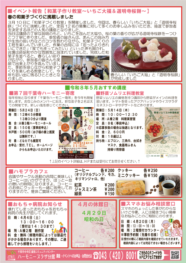 蘇我コミュニティセンター ハーモニープラザ分館では、今年度も地域の皆さまに楽しんでいただける講座やイベントを多数ご用意しております。