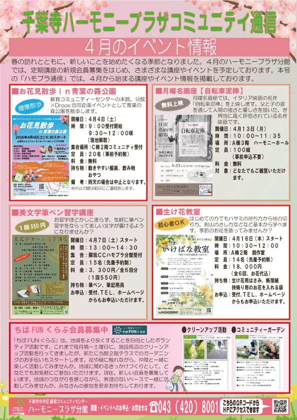 蘇我コミュニティセンター ハーモニープラザ分館では、今年度も地域の皆さまに楽しんでいただける講座やイベントを多数ご用意しております。
