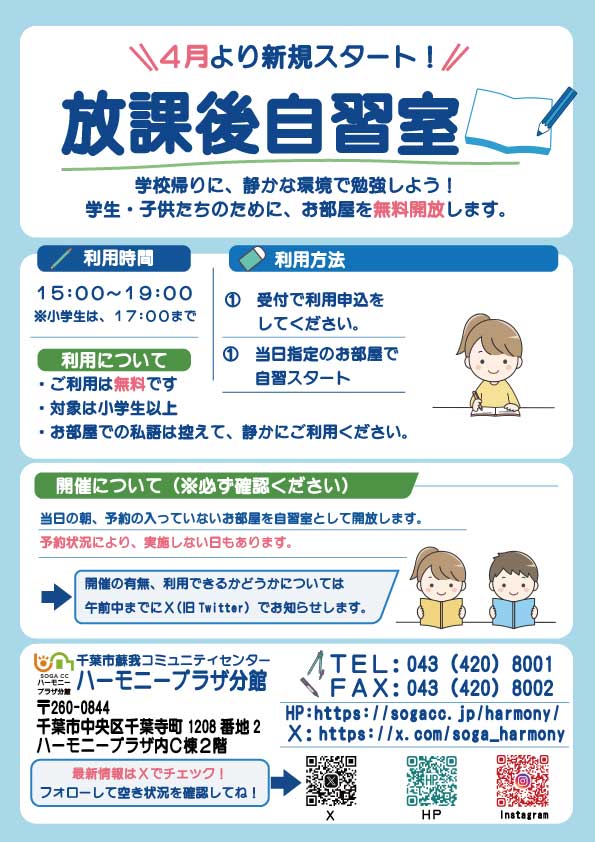 学生・子どもたちの学習機会の充実を目的として、「放課後自習室」を4月よりスタートします。
