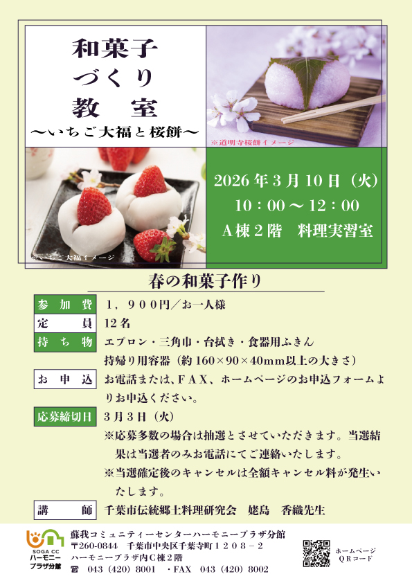 今回の和菓子づくり教室は【いちご大福と道明寺桜餅】を作ります。 開催日時 2025年…