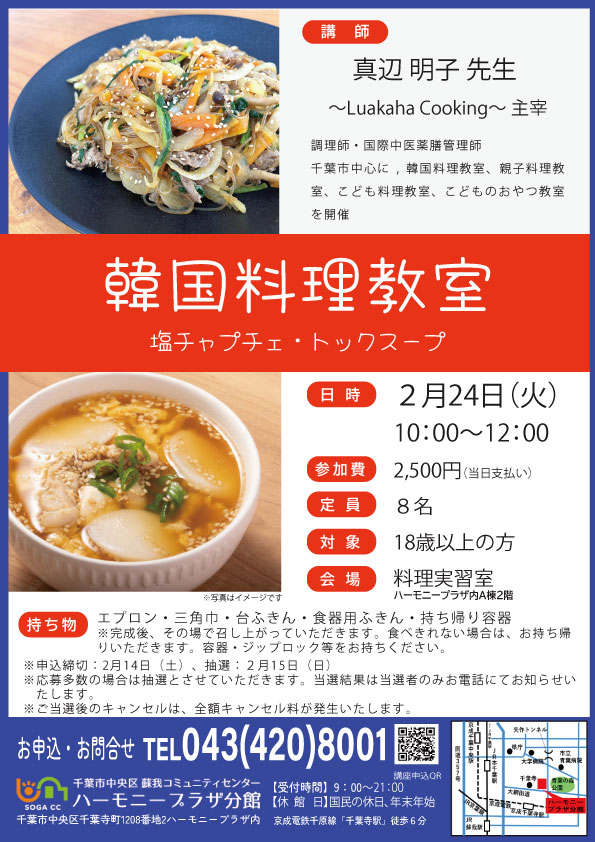 令和8年2月24日(火)に韓国料理教室~塩チャプチェ・トックスープを開催いたします。 是非ご参加を…
