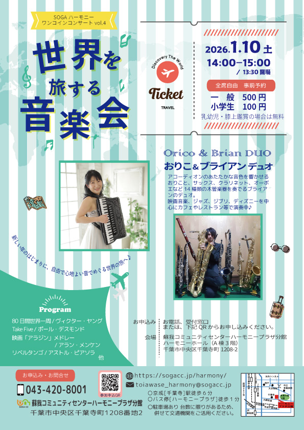 【世界を旅する音楽会】を開催いたします♪ 約60分間のニューイヤー・ワンコインコンサート。アコーデ…