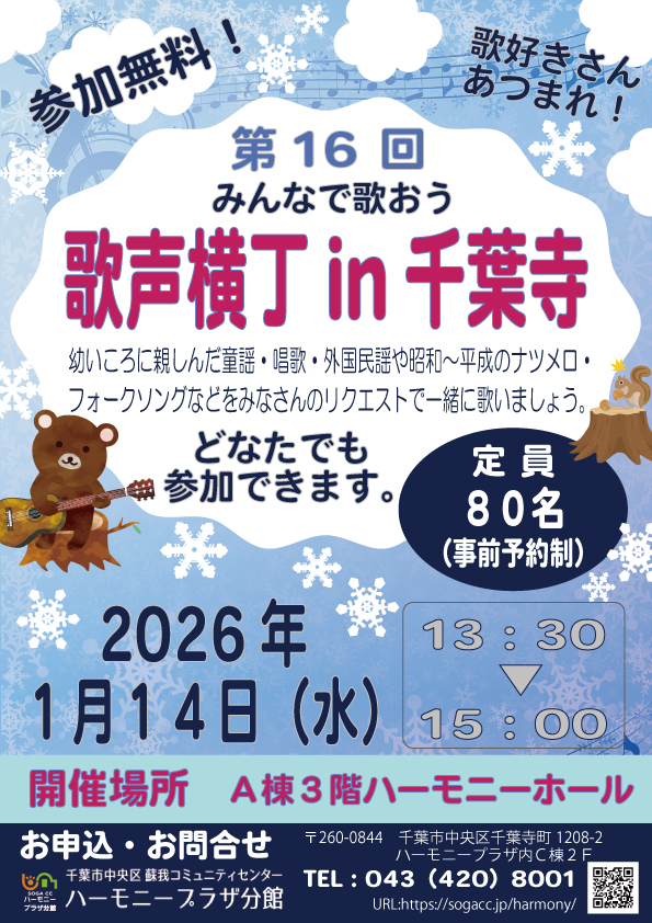 令和8年1月14日(水)に第16回みんなで歌おう『歌声横丁in千葉寺』を開催いたします。 懐かしい…